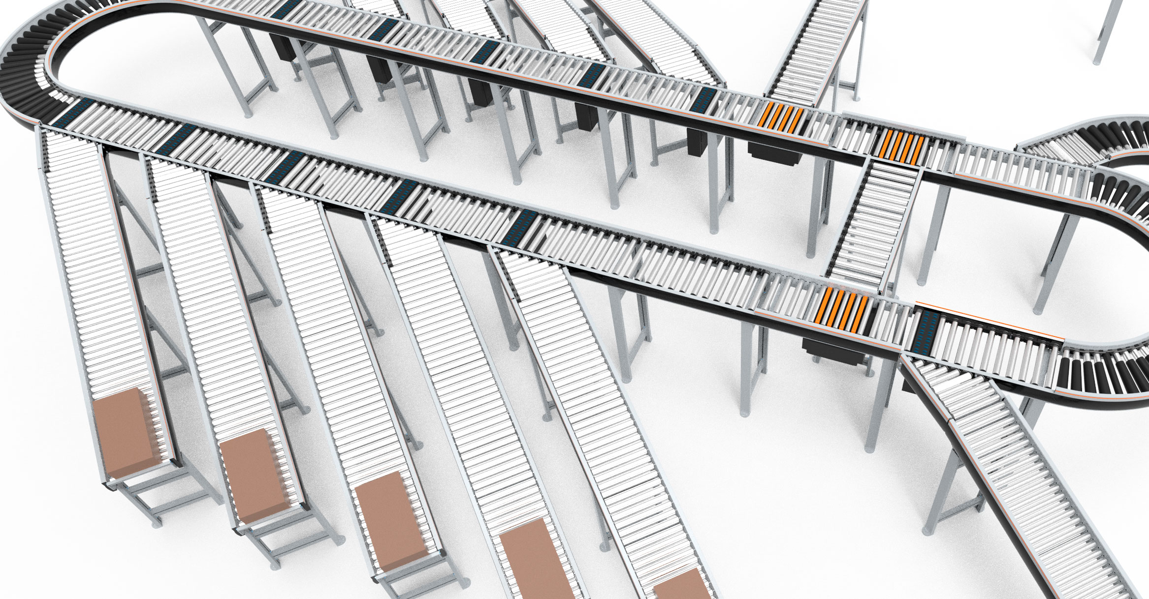 Transportador de rodillos en curva DC: con ayuda de un PLC, cambia la dirección de transporte de la carga. Sus rodillos cónicos hacen que se guarde la orientación entre las caras laterales. Cada tramo tracciona a partir de un motorrodillo conectado a los rodillos a través de correas polyV.