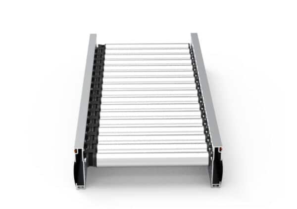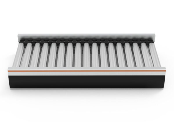 El transportador de rodillos DC, con ayuda de un PLC, hace que el transporte de mercancía se haga en acumulación sin presión. Cada tramo autónomo tracciona a través de un motorrodillo conectado a los demás rodillos con correas polyV.